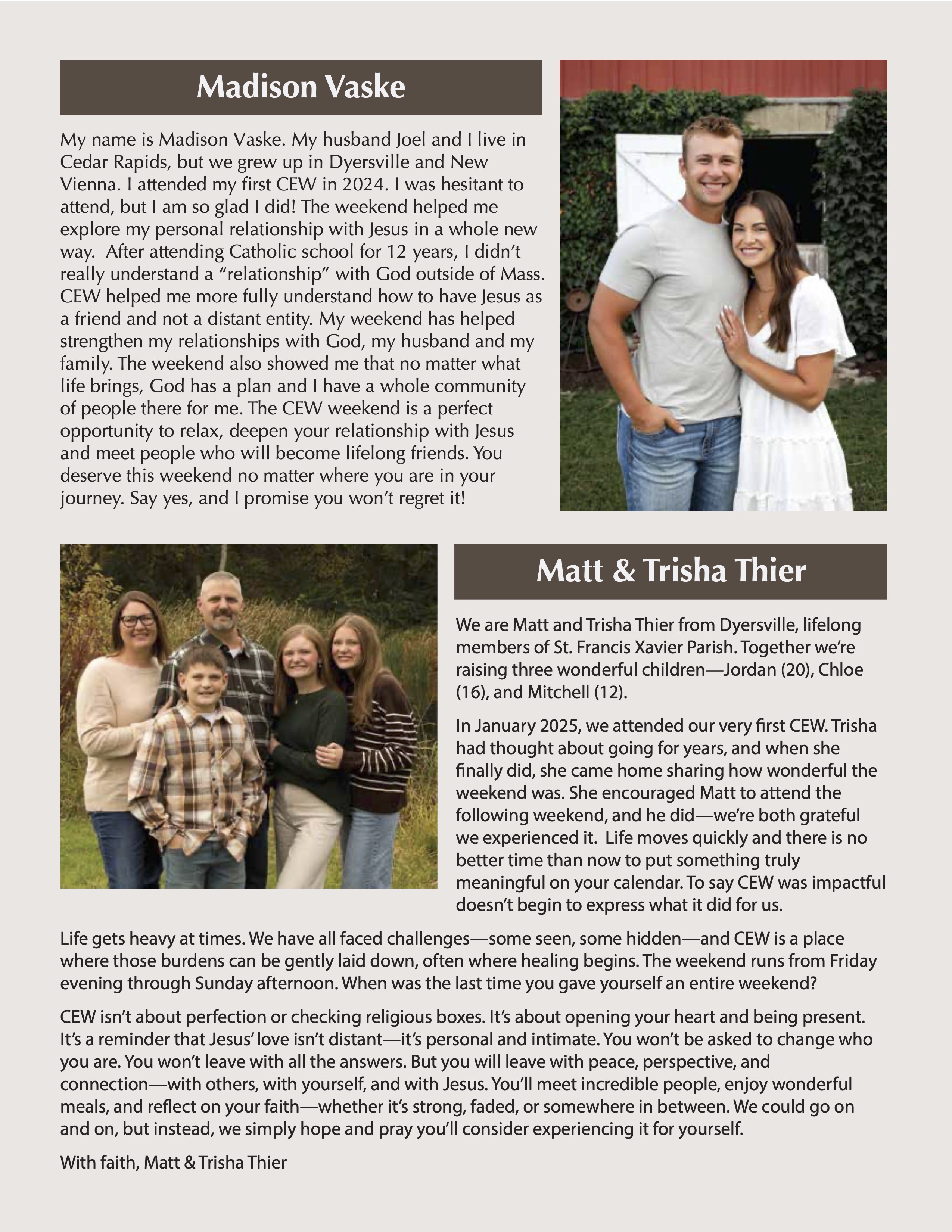 Welcome to the Farley-Epworth CEW online community. Every January since the late 1980’s we have gathered as a community for men’s and women’s CEW weekends in the Farley-Epworth area. The CEW is an incredible experience where all are invited to join with us to start a journey to grow closer to God. Please consider reaching out and we would LOVE to have you join us too!